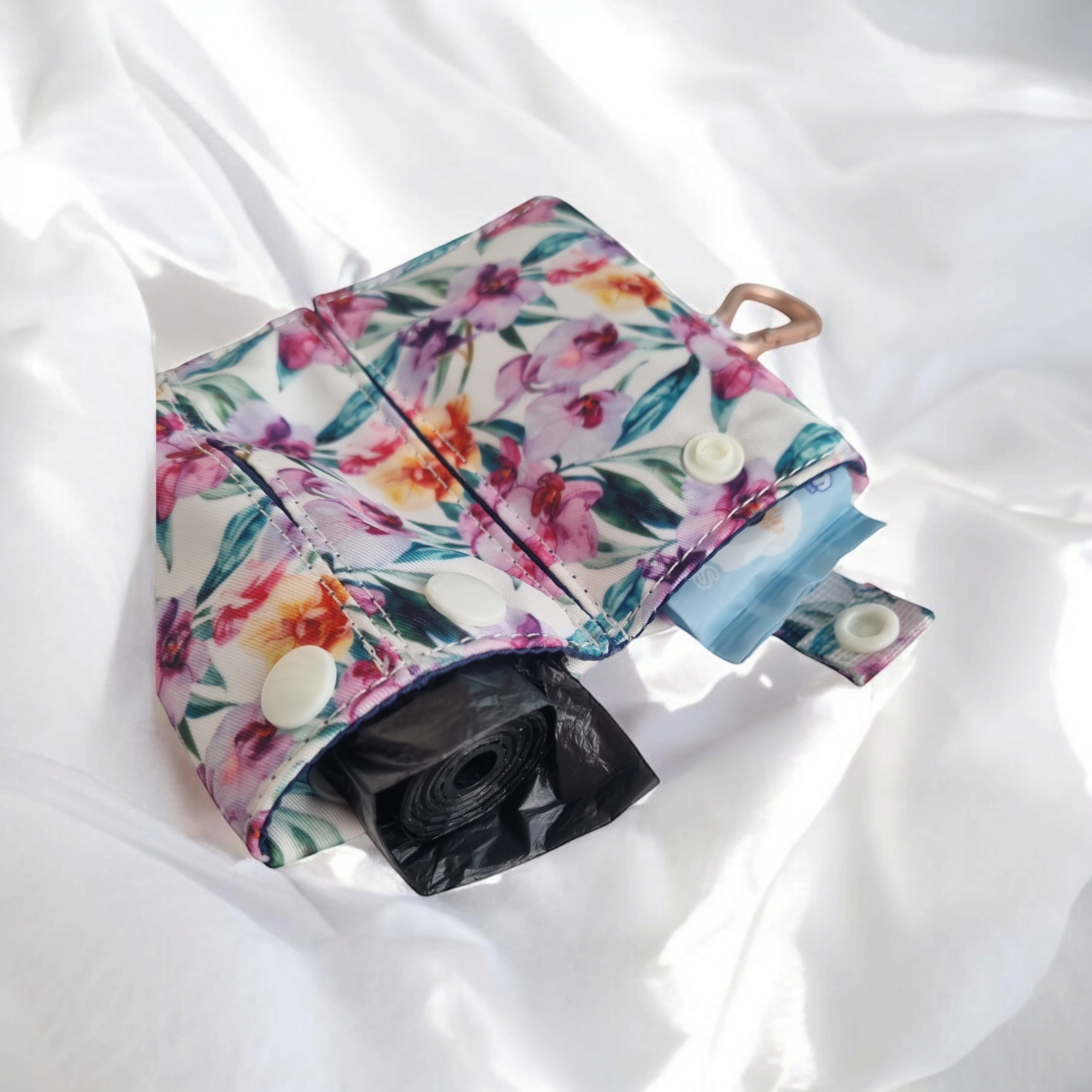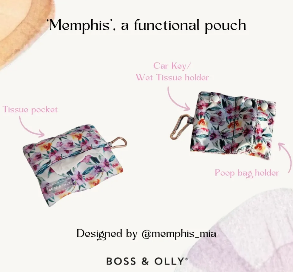 Fits: One roll of standard poo bags, mini wet tissue pack or car keys and a packet of dry tissue