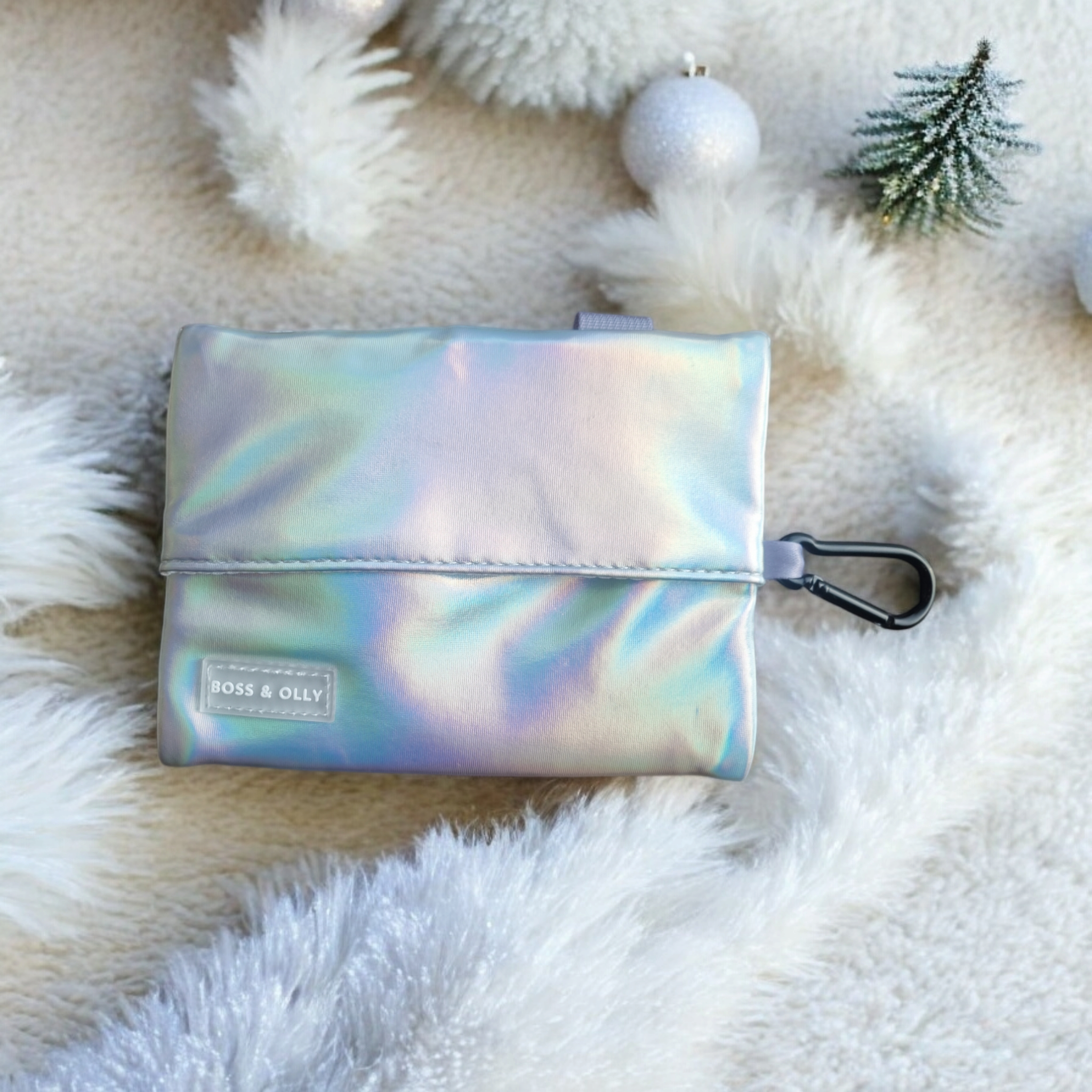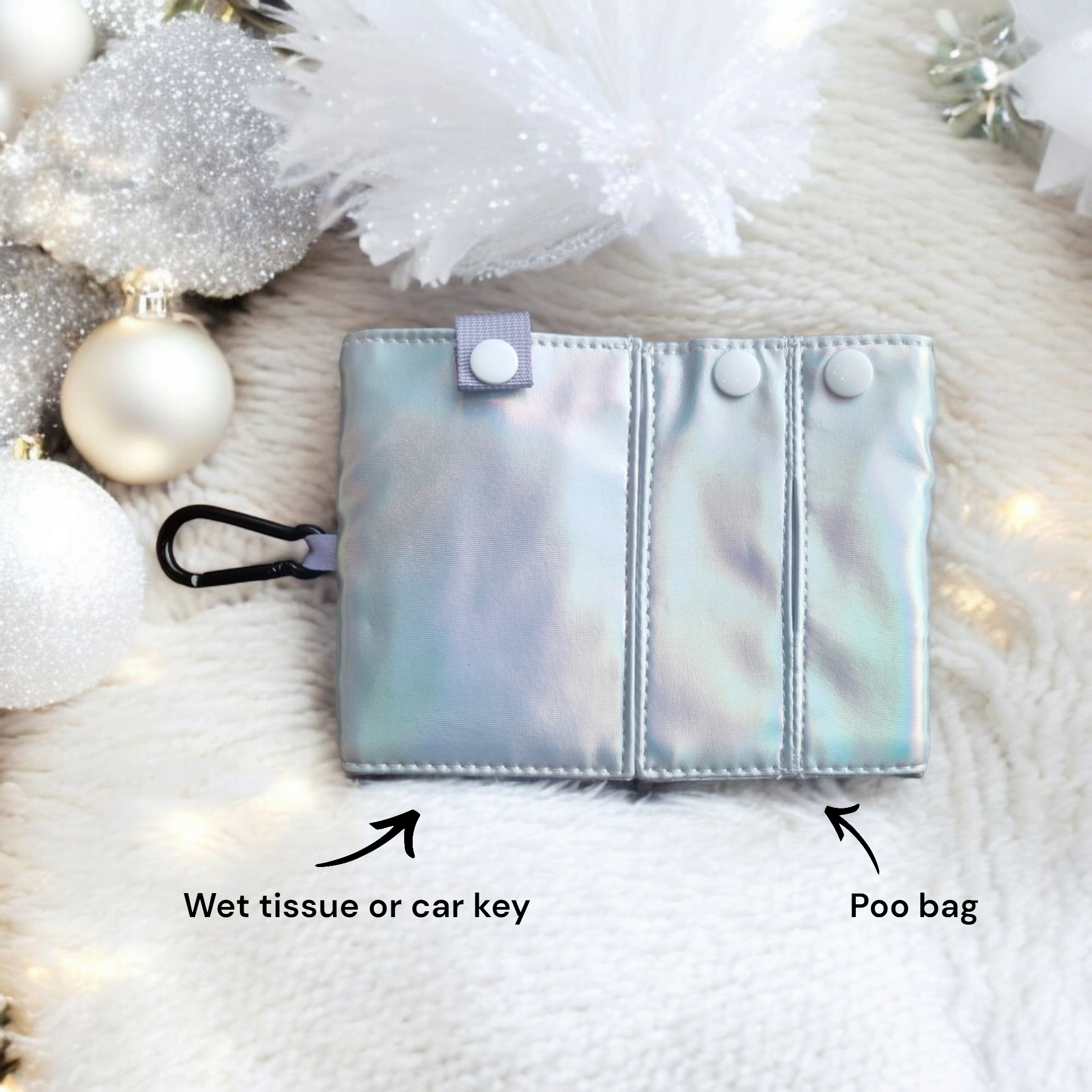 Fits: One roll of standard poo bags, mini wet tissue pack or car keys and a packet of dry tissue