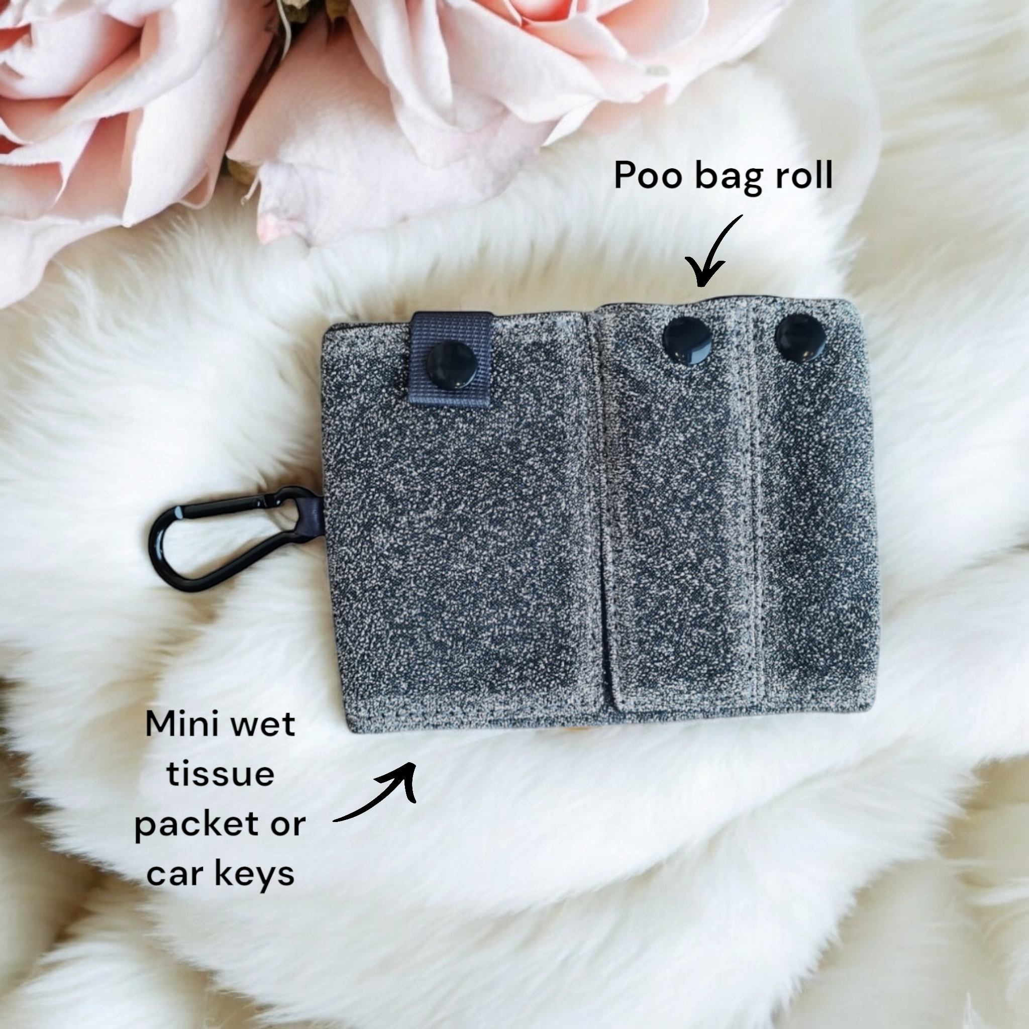 Fits: One roll of standard poo bags, mini wet tissue pack or car keys and a packet of dry tissue