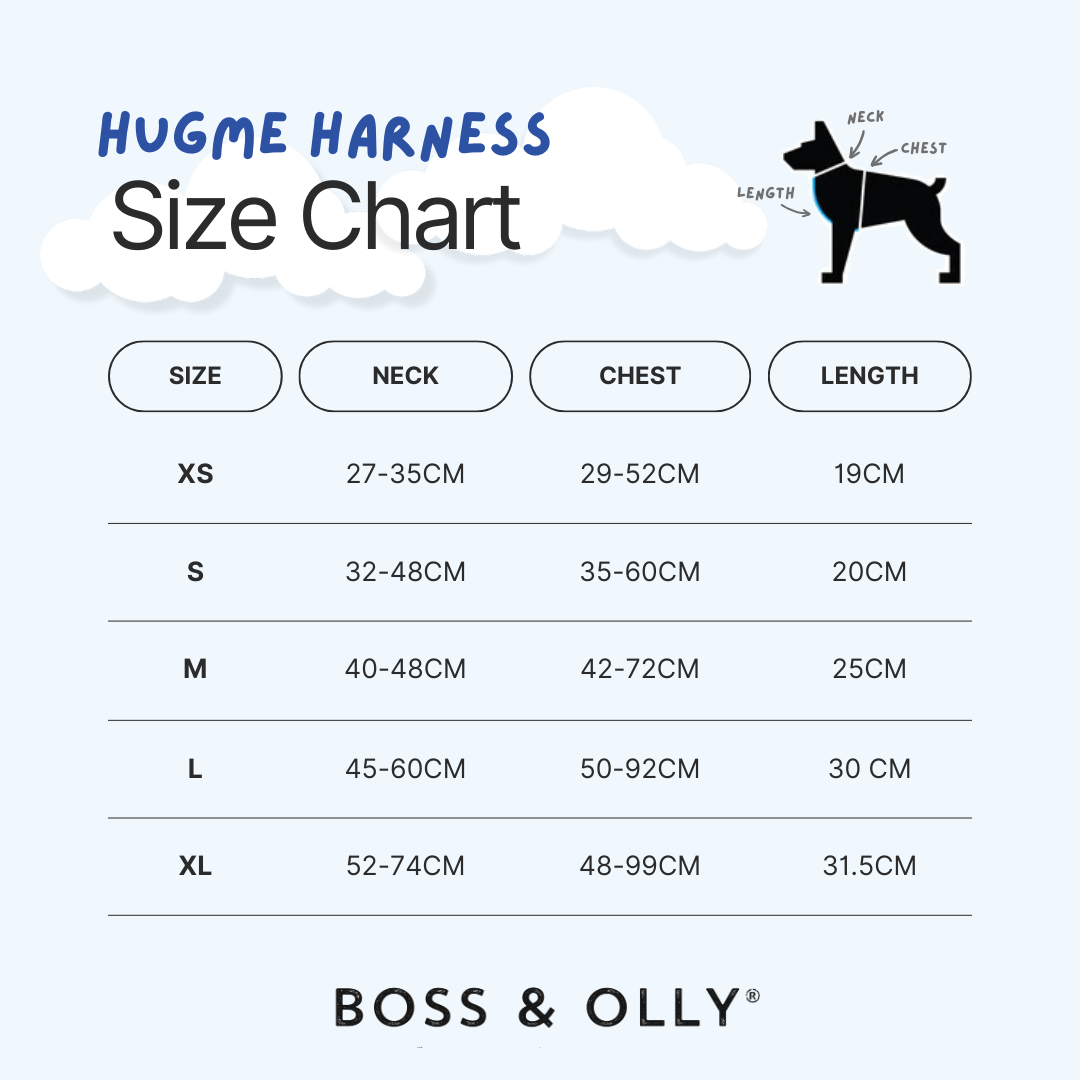 Boss & Olly HugMe Harness comes in 5 sizes. Here's a size guide. We recommend sizing up if your pet is in between sizes. If you are unsure which size to order, please contact us for a fitting session, or recommendations.