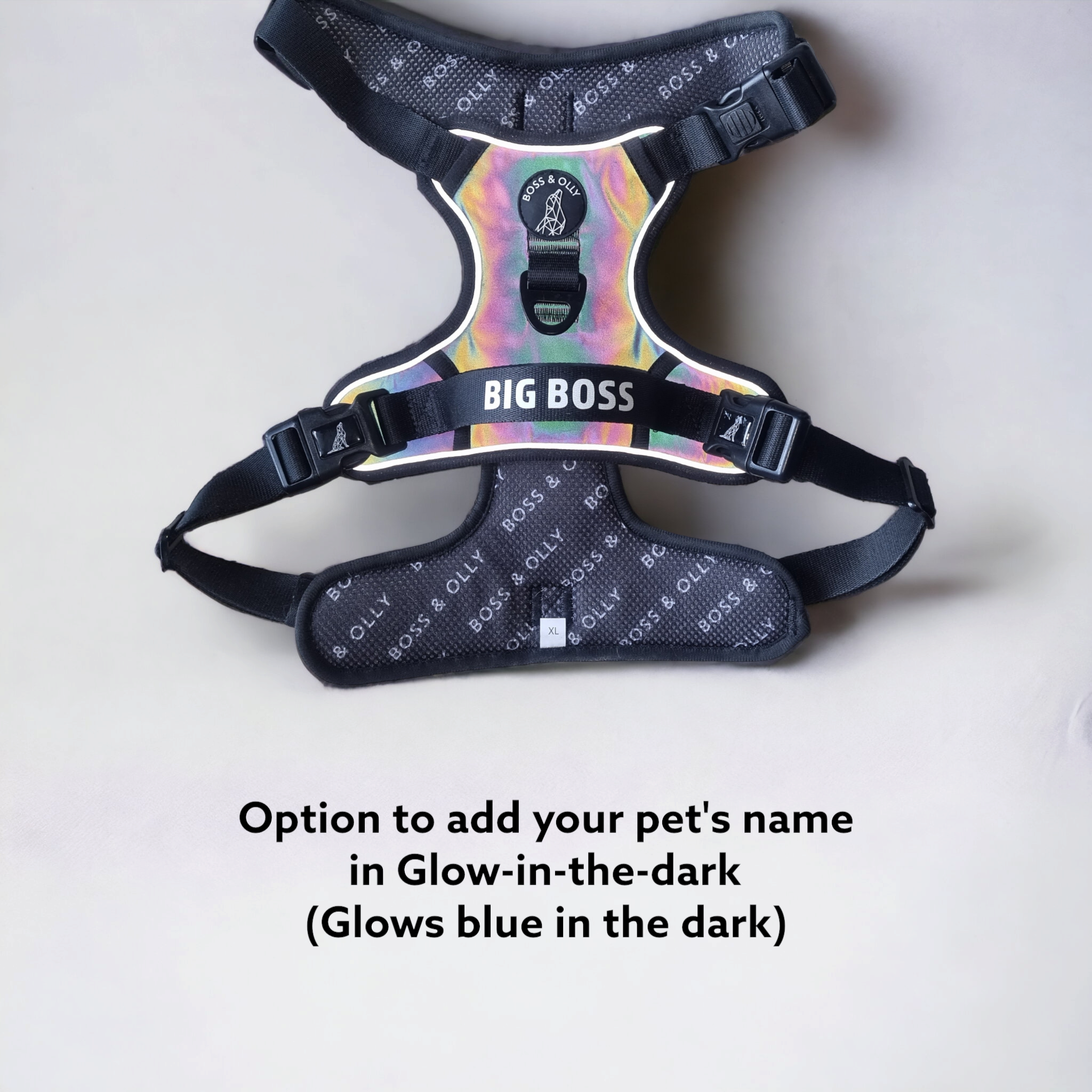 • Fully Reflective Outer Shell: Our Mystique Active Harness boasts a fully reflective outer shell that reveals rainbow colors when illuminated by the headlights of cars or bicycles, enhancing visibility in low-light conditions. However, the reflective material is less scratch-resistant than the Oxford outer shell used in our classic range, so extra care is needed to maintain its appearance and durability during active use. Your pet's safety remains our top priority.
