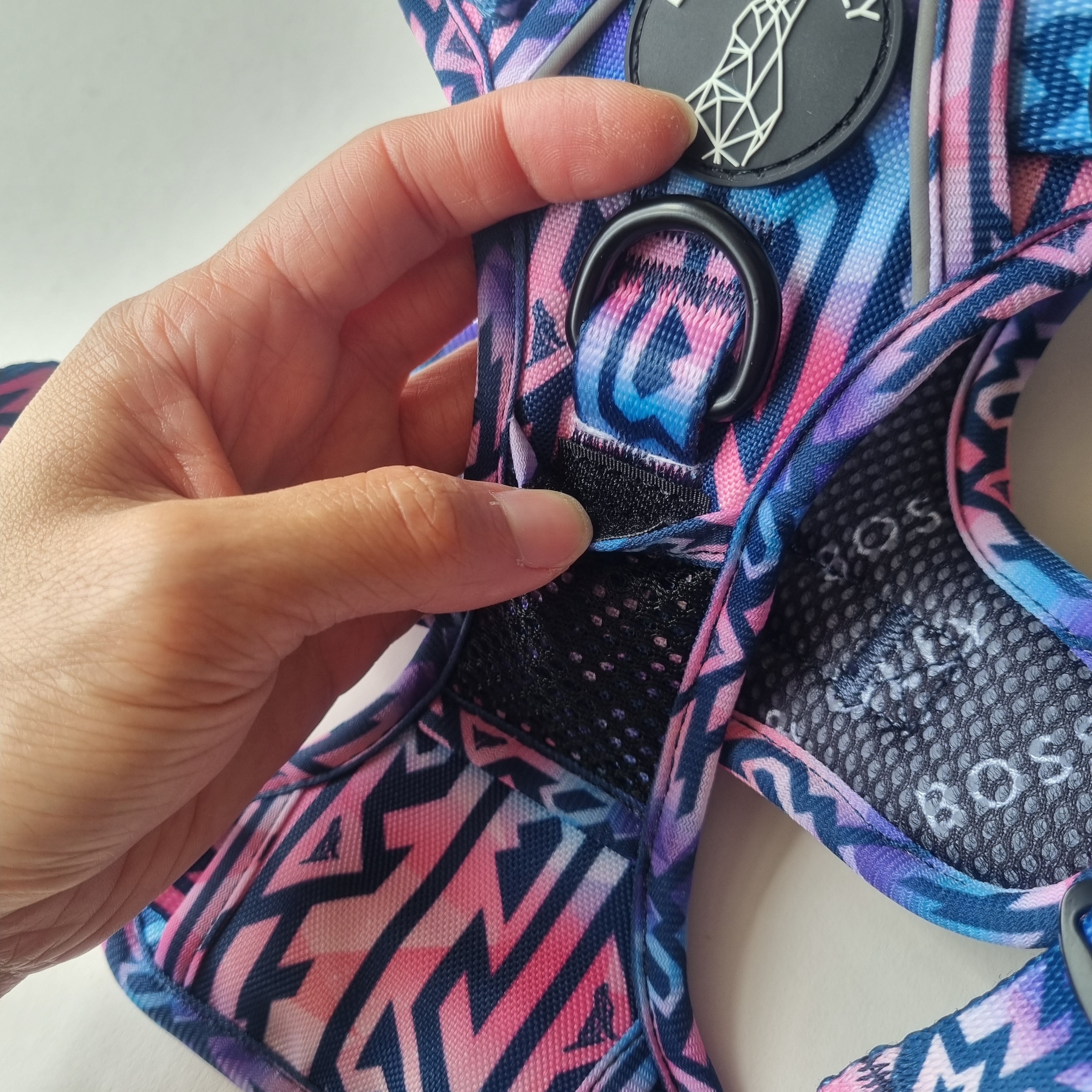 +Front and back D ring attachment points. Attaching your leash to the front D ring discourages tugging while the back D ring attachment point is good for relaxed walks and Ergonomic design. The front D ring can also be used to attach your pet's ID tag or an airtag (newly added velcro pocket).