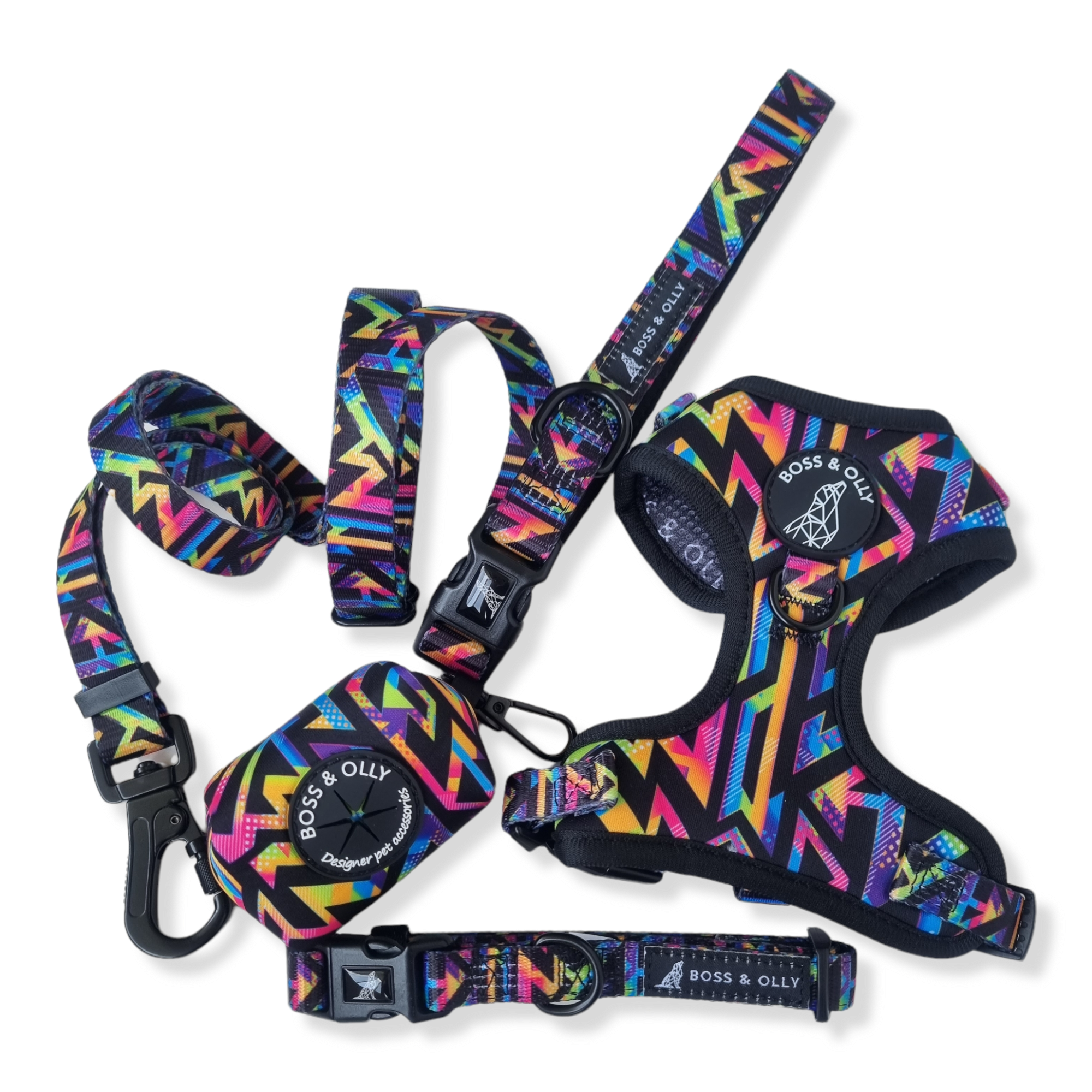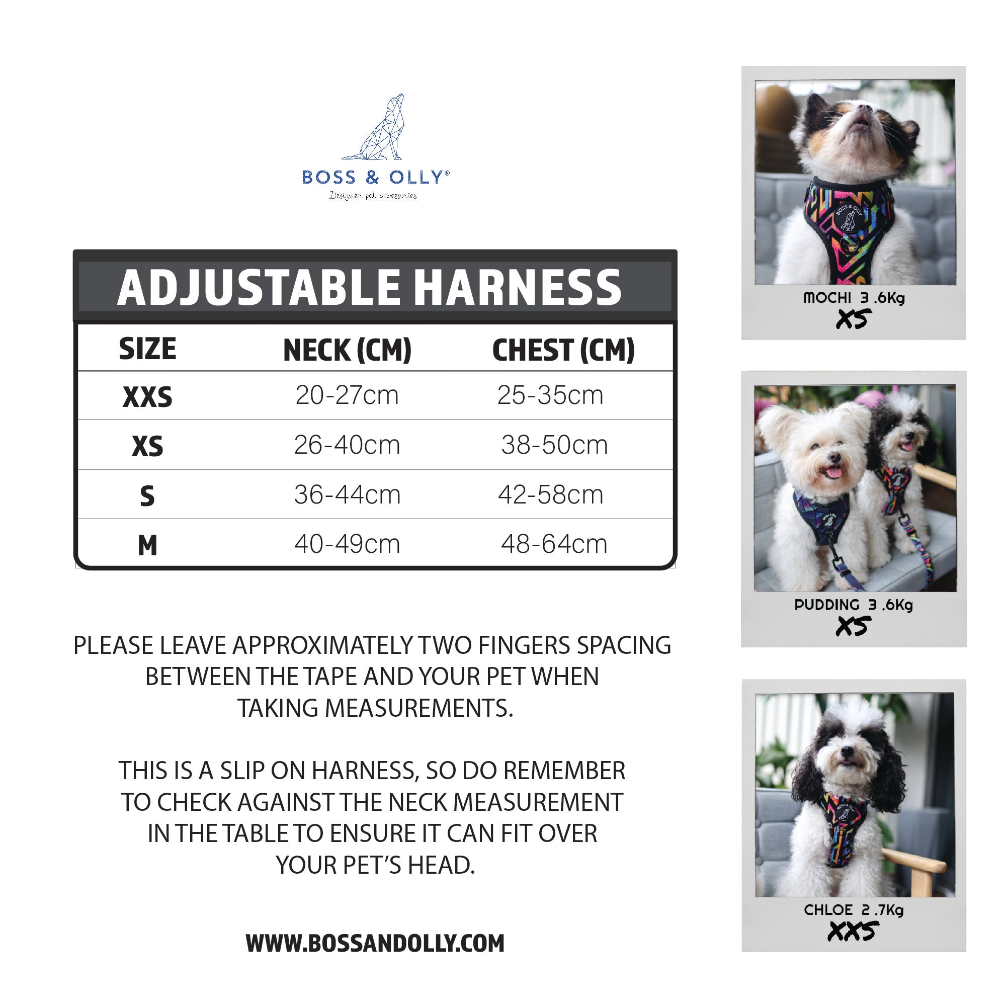 Boss & Olly Adjustable Harness comes is 4 sizes. If you are unsure which size to order, please contact us.